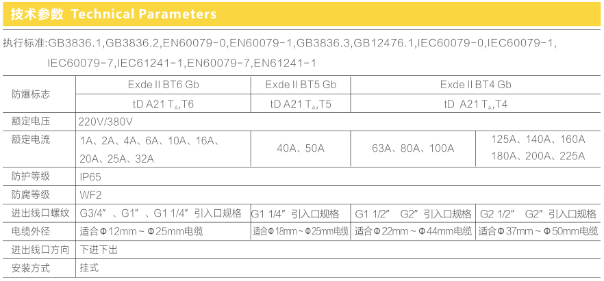 ● 內(nèi)裝防爆斷路器,63A及以內(nèi)的采用TDL防爆斷路器模塊,超過(guò)63A為特制防爆元件,高強(qiáng)度金屬外殼,結(jié)構(gòu)合理,防爆性能好;