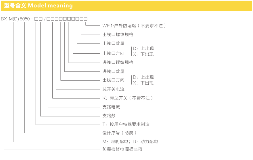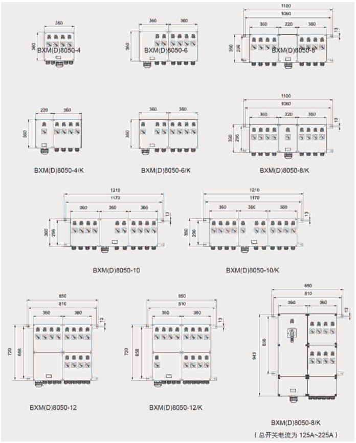 ● 總開(kāi)關(guān),分開(kāi)關(guān)操作面板區(qū)分明顯,便于現(xiàn)場(chǎng)識(shí)別;內(nèi)裝斷路器為特制的防爆原件;總開(kāi)關(guān)電流最大可至225A;模塊化設(shè)計(jì),多回路組合。